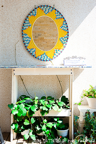小桌上有個馬賽克磚拼成的鏡子